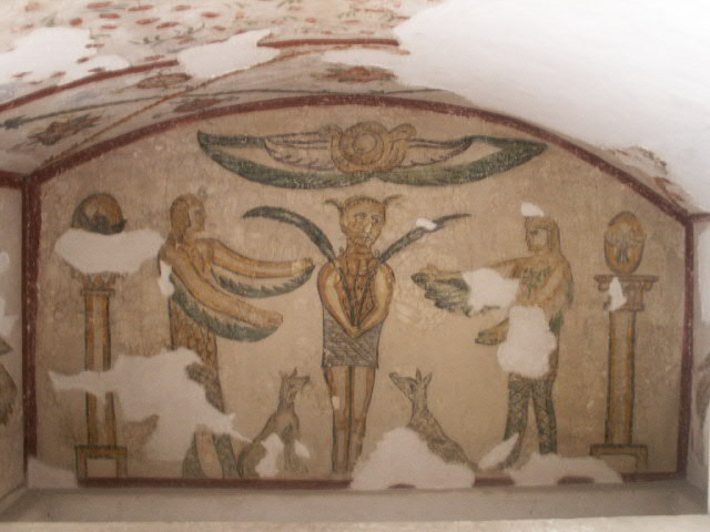 Au centre de la façade, le disque solaire familier surmonte une frise de serpents ; à gauche et à droite deux serpents portent les couronnes de la Basse-Egyptr et de la Haute-Egypte. Ce ne sont pas comme les cobras de Saqqarah ou de Thèbes : ils semblent être conçus comme une bande dessinée moderne. Dans la chambre du tombeau, le décor comprend Horus, Thot, Anubis, le prêtre dans sa peau de panthère, et le roi faisant une offrande aux défunts sous forme d'Osiris. Ces figures sont rendues dans le modèle gréco-romain. Aux scènes traditionnelles s’ajoutent les groupes supplémentaires de raisins, de têtes de méduse, et d'une variété de décors grecs et romains.