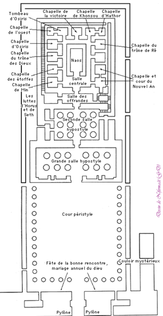 La salle du sanctuaire est précédé par le vestibule, la salle des offrandes, 2 salles hypostyles, avec chacune 12 colonnes, représentation des 12 heures diurnes et des 12 heures nocturnes. Sur le plafond de la première salle hypostyle, la déesse Hathor est représentée 365 fois, afin de préserver le temple des influences néfastes tout au long de l’année.