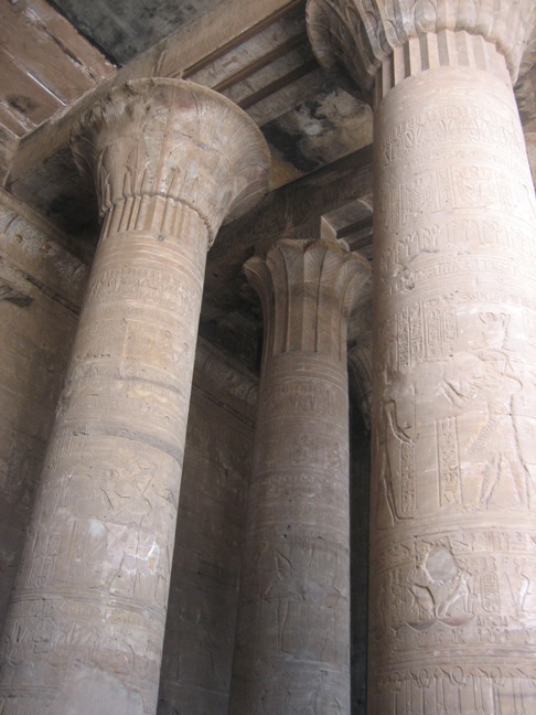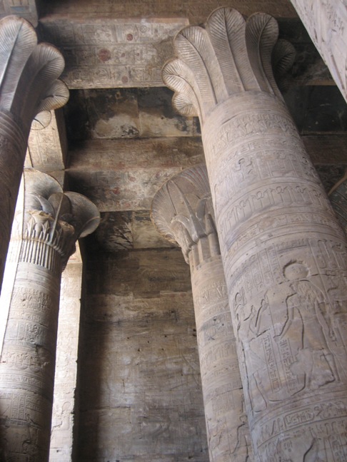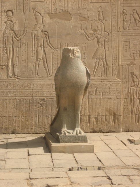 C’est dans la cour péristyle, devant l’entrée de la 1ère salle hypostyle que trône la célèbre statue d’Horus taillé dans du granit noir d’Assouan.