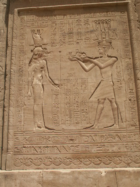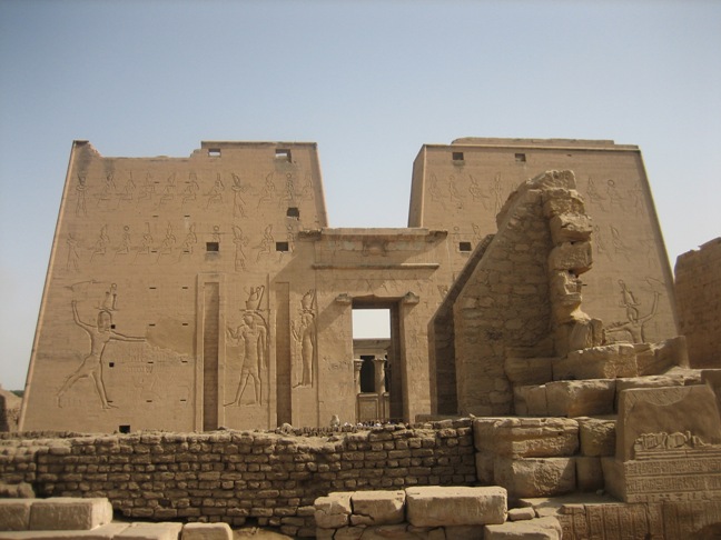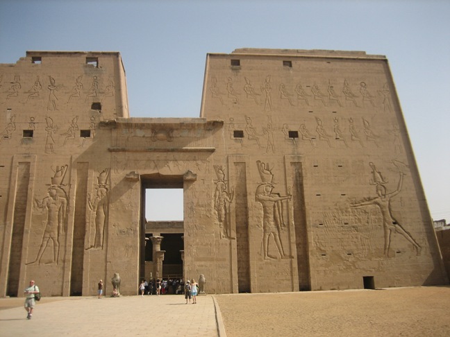 Edfou est le temple le mieux conservé de toute l’Egypte antique. Dédié au dieu faucon Horus, il fut érigé à l’époque ptolémaïque sous Ptolémée III. Lla première pierre de ce temple fut posée le 7 épiphi de l’an X du règne de Ptolémée III (le père de Cléopâtre) soit le 23 août 237 av. J-C. suite au marquage du périmètre par le pharaon, assisté du dieu Horus et de son épouse la déesse Hathor.