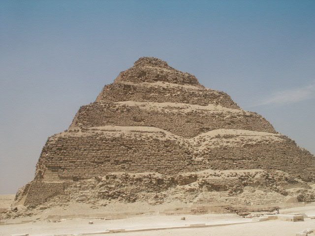 La pyramide à degrés est le premier grand édifice en pierres appareillées jamais construit par des hommes. Elle est de plan rectangulaire (109 x 121 m) Chaque « degré » est large de 2 mètres et sa hauteur varie de 8,40 mètres à 10,10 mètres. Toutes les pierres sont disposées horizontalement (lits inclinés dans certains cas). Elles ont encore des dimensions restreintes comme s'il s'agissait de briques de pierres et sont d'une hauteur d'environ 25 cm Ce n'est que dans les constructions postérieures qu'on a fini par atteindre les dimensions beaucoup plus importantes connues ailleurs.