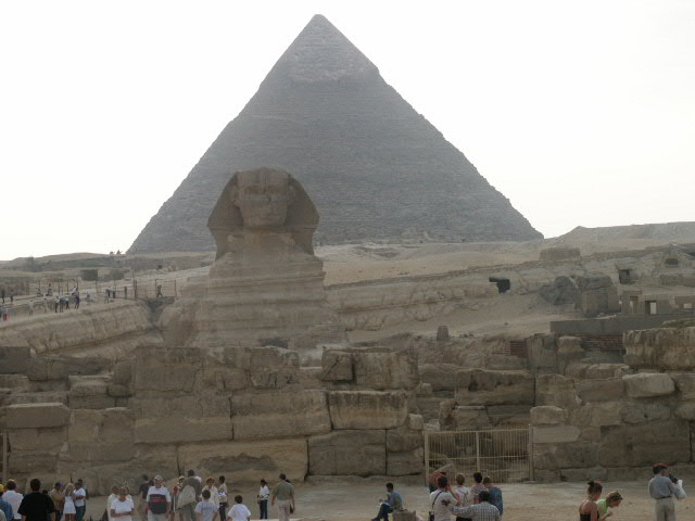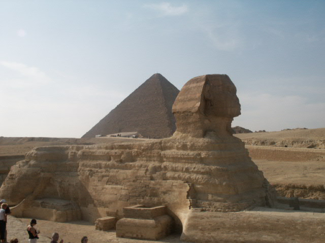 Taillé à même le roc, ce lion couché à tête humaine était chargé de veiller sur la nécropole de giseh. Le visage tourné éternellement vers l'orient serait celui de Khephren recouvert de la coiffe de Nemes (coiffe rayée) réservée aux personnalités royales. Il était doté d'une barbe tombée par terre et aujourd'hui exposée au British Museum de Londres.