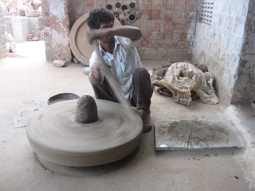 L'artisan fait tourner manuellement une dalle en pierre la terre est faite de sable et d'eau