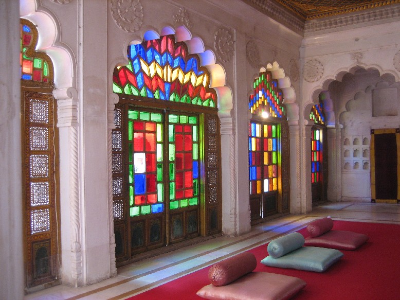 À l'intérieur se trouvent plusieurs palais connus pour leurs sculptures et leurs successions de cours.  Les appartements des palais portent des noms évocateurs tels que Sukh Mahal, ou palais des plaisirs, Phool Mahal, ou palais des fleurs ou sont également armoiries de Jodhpur. Ils abritent une merveilleuse collection de pièces royales, dont plusieurs howdah (nacelles installées sur le dos des éléphants où les maharajas prenaient place lors des processions), des miniatures de plusieurs écoles ainsi que des salles d'armes, des palanquins, des meubles et des costumes. De la terrasse aux canons, on découvre une grande partie de la ville avec de nombreuses maisons badigeonnées de bleu.  Le Moti Mahal à la façade sculptée abrite le trône royal de Jodhpur, le Sringar Chowki. La villa Umaid renferme des miniatures rajpoutes et la villa Ajit renferme des instruments de musique et des costumes royaux.
