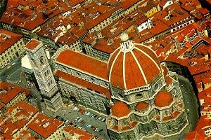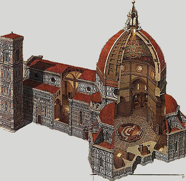La somptueuse cathédrale (duomo) gothique Santa Maria del Fiore en marqueterie de marbre polychrome domine la ville de son imposante coupole conçue par l'architecte Brunelleschi. La construction de l'édifice nécessita presque deux cents ans de travaux, davantage si on considère la façade, achevée seulement au XIXe.
