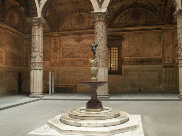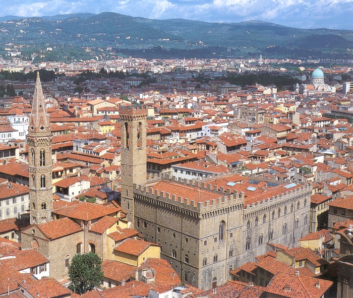 C'est Cosme I de Médicis qui transforma ce palais pour en faire sa résidence, il le fit agrandir et somptueusement décoré. Vasari et son équipe d'artistes réalisèrent les nouvelles décorations du palais : Salon des Cinq Cents, Appartements de Léon X, Appartements de Cosme, Appartements d'Eléonore de Tolède, Salle des Audiences, la salle des Cartes Géographiques.