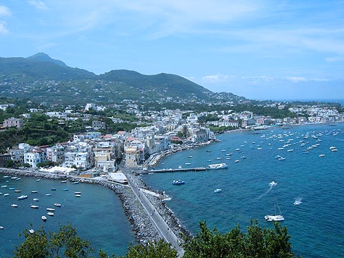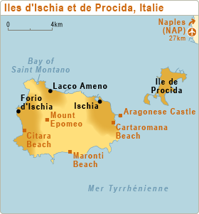 Ischia (39km de pourtour et environ 47km² de superficie) a une population résidente de 50.000 habitants. Elle fait partie des stations hydro-thermo-climatiques marines et touristiques les plus renommées d'Italie et du monde. Pour celui qui vient du continent, Ischia se présente comme une vision idyllique où le mélange de couleurs (vert, bleu et blanc) le porte au rêve. L'ambiance est faite d'une toute simplicité. Les villages ont conservé leur authenticité et l'île est moins sophistiquée que Capri.