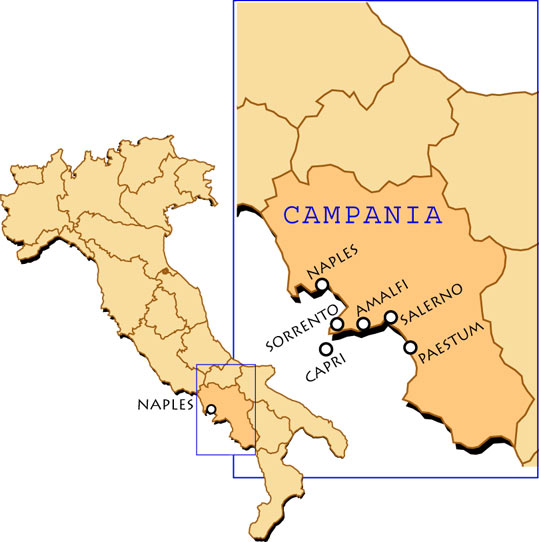 La côte amalfitaine tourne le dos au golfe de Naples. Ce ruban rocheux est peut-être la plus belle côte d'Italie. Une route étroite serpente entre Salerne et Sorrente, distantes de 45 petits kilomètres! Autant dire qu'on peut parcourir cette bande littorale en une journée.