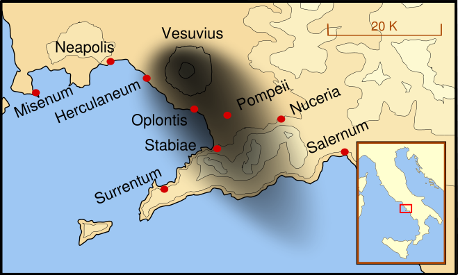Misène, à la pointe nord du golfe de Naples, un jeune homme de 17 ans, Pline le Jeune, assiste à l'éruption et en rédige le compte-rendu détaillé dans deux lettres. Les vulcanologues donneront bien plus tard le qualificatif de plinéen à une éruption volcanique comme celle qu'il a décrite.