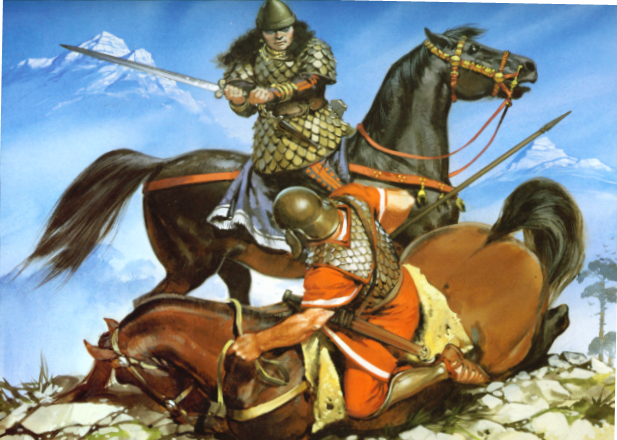 Arrivée de la cavalerie gothique: au même moment, la cavalerie de Saphrax et d'Alathée, composée de Greuthungues, de Alains et de Huns, surgit des hauteurs comme la foudre et balaie tout sur son passage. Cette surprise appelle deux remarques: les Romains n'ont pas disposé d'éclaireurs autour du champ de bataille; l'arrivée d'une telle masse de cavalerie visible de loin par la poussière qu'elle dégage, a été masquée par la colline où était situé le camp barbare.