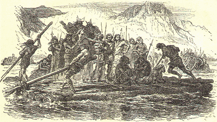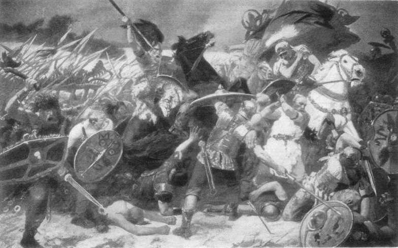 Déroute romaine: en fin d'après-midi les pertes, la pression psychologique et l'épuisement deviennent si intolérables que les Romains partent en déroute et se dispersent, abandonnant des tas de cadavres. Il faut en déduire que l'enveloppement n'était pas complet, mais laissait une issue sur l'aile droite. La poursuite est un massacre. Les Romains sont abattus dans le dos à la lance ou à l'épée, ou écrasés par la masse des fuyards et des assaillants. Les routes sont encombrées de blessés et de chevaux tués. La nuit met fin au massacre.
