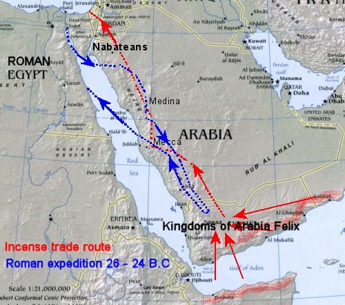 C'est en 25 av JC, sous le règne d'Obodas III que le préfet d'Egypte Gaius Aelius Gallus, dirige une expédition militaire vers l'Arabia Felix, sur l'ordre de l'empereur Auguste. Le but est de reconnaître l'origine de l'encens et des autres marchandises précieuses que les Nabatéens vendent et pouvoir commercer directement avec l'Arabie du Sud. Gallus part avec 10 000 soldats romains et égyptiens et prend pour guide un gouverneur nabatéen, Saleh (Syllaios, Sylleus) que lui fournit le roi. Ce guide persuade Gallus que la route par la terre est impraticable, lui fournit 1 000 hommes et lui recommande d'équiper une flotte dans le port de Cleopatris (au sud de l'actuel canal de Suez). Les Romains construisent des navires peu adaptés à la mer Rouge. Ils recommencent et après quinze jours de navigation difficile, nous dit Tacite, et des navires perdus, atteignent le port nabatéen de Leukè Kômè (Port Blanc), malades du scorbut et d'autres maladies. L'armée passe l'hiver au port.