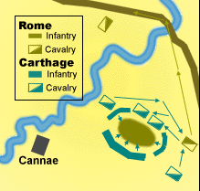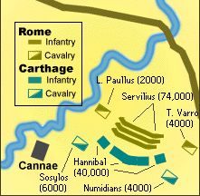 Les 2 consuls romains sont pourvus chacun de 4 légions, soit 8 en tout ! A 5 000 hommes et 300 chevaux par légion, c'est 40 000 légionnaires et autant d'alliés italiens plus 7 200 chevaux qui s'avancent vers Hannibal, et ces troupes ont combattu depuis deux ans, c'est une armée nombreuse et bien entraînée. Hannibal dispose de 50 000 hommes et 10 000 chevaux. Il n'a plus d'éléphants. Les consuls se placent chacun à la tête d'une aile de cavalerie. Le centre romain est fort et compact, l'intervalle hbituel entre les manipules est très réduit : 3 rangs de 20 000 hommes sont précédés de 10 000 vélites. A l'aile droite, 3 000 cavaliers romains sont commandés par Paul Emile tandis qu'à l'aile gauche, Varron dirige 4 000 alliés (cavalerie lourde). Chez Hannibal, le centre est composé de 30 000 Celtes, Gaulois et Ibères, bien encadrés et équipés de cottes de mailles et de chaque côté, une phalange africaine armée à la romaine de 7 000 hommes flanque ce centre. A l'avant se trouvent 3 000 frondeurs baléares protégés chacun par un lancier. Toute cette partie de l'armée est commandée par Hannibal en personne aidé par Magon. Sur les ailes, à droite, 4 000 Numides commandés par Marhabal font face à Varron. A gauche, Hasdrubal dirige 6 000 cavaliers espagnols face à Paul Emile. "Sur le papier" les Romains sont les plus forts !
