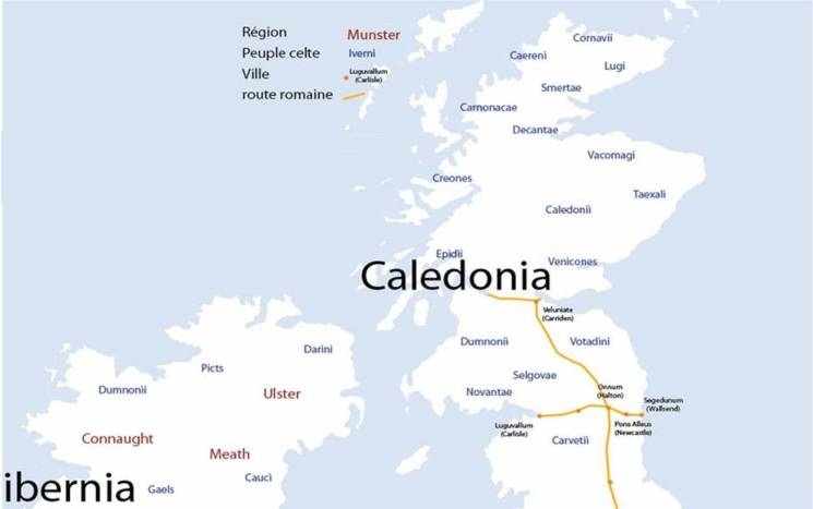 Les Romains ne conquirent jamais l'Irlande. L'historien romain Tacite rapporte, dans sa Vie d'Agricola, que le général romain se tenait sur la côte ouest d'Ecosse et regardait, par-delà la mer d'Irlande, l'île d'Emeraude. Il avait certainement pensé à la conquérir, mais ne fit aucune tentative, sans doute parce que l'Irlande manquait de tout ce dont Rome avait besoin. L'Irlande et le nord de l'Ecosse restèrent des bastions celtes, aux confins du monde romain.
