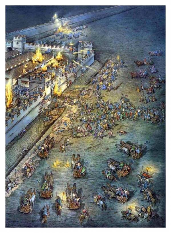 Mais la ligne bretonne est tout à fait désorganisée et Paulinus lance l'attaque des légionnaires formée en coin. Les Romains, avec leur armure, leurs armes supérieures et leur discipline, bénéficient d'un avantage décisif dans ce combat rapproché et repoussent la masse des Bretons. C'est alors que les cavaliers romains interviennent, la lance tendue, dans la mêlée. Les pertes s'accumulent chez les Bretons et ils cherchent à sortir de ce piège mais ils sont bloqués par les chars et la tuerie commence. Les légionnaires attaquent aussi les femmes, les enfants et les animaux. Tacite nous fournit une estimation pour les pertes : 80 000 Bretons et 400 Romains sont restés sur le sol.