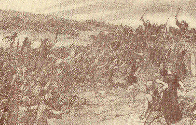 Le combat commence là, les renforts arrivent des deux côtés et la bataille devient générale. Les Ambrons accourent et attaquent au pied de la colline et sont arrêtés par les Ligures, puis viennent les légions qui taillent en pièce la masse des Ambrons qui sont venus en renfort et les poursuivent jusqu'à leurs chariots formant un rempart et où les femmes accueillent les fuyards et les légionnaires à coup de hache ou d'épée. Mais Marius est inquiet car les fortifications ne sont pas terminées. Le lendemain, dans le camp romain on soigne les blessés et achève la fortification du camp.