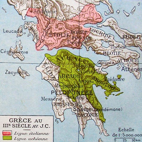Ce sont Ies Etoliens, peuple montagnard et inculte des contrées pauvres et déshéritées qui s'étendent à l'ouest du Pinde jusqu'à la mer; longtemps morcelés, ils ont organisé une fédération perpétuelle ou Ligne étolienne qui remet à un pouvoir central le soin des intérêt généraux de la nouvelle nation. Dans l'affaiblissement où sont tombées les grandes villes directrices de la Grèce, elle va devenir un centre de ralliement rayonnant au loin.