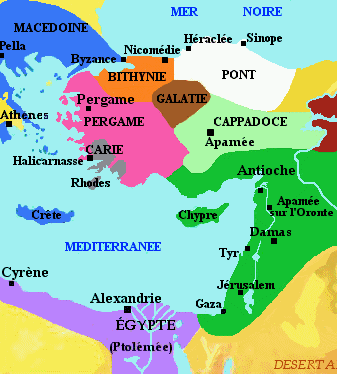 Eumène II Roi de Pergame, allié avec les Romains, il étend ses états sur presque toute l'Asie Mineure ; Grand bâtisseur, il aggrandit Pergame et son acropole (grand autel de Zeus); Il fonde Hiérapolis.