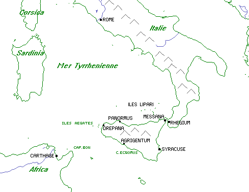 Les Mamertins avaient déjà chassé les Carthaginois et une garnison romaine s'installa à Messine. Les légionnaires repoussèrent les forces puniques mais furent bientôt assiégés dans cette ville par les troupes de Carthage et de Syracuse alliées. En 263 av. J-C., deux consuls débarquèrent avec 4 légions.