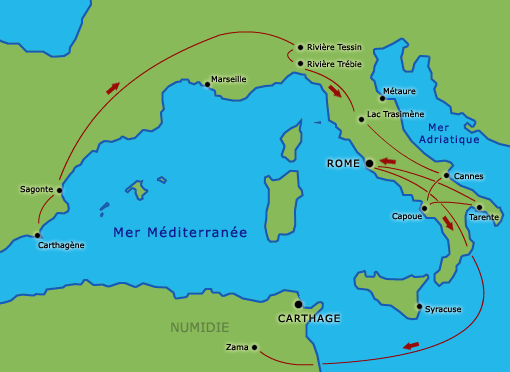 L'appellation "Guerres Puniques" désigne le conflit qui opposa Carthage à Rome, de 264 à 146 avant Jésus-Christ, et ayant inévitablement abouti à la destruction de Carthage. On divise le combat en trois phases actives: la première est une lutte pour la possession de la Sicile, la deuxième est animée par une volonté de revanche menée par une famille carthaginoise (les Barcides) et la dernière, quant à elle, est la décision par les latins de détruire le royaume ennemi - pour des raisons qui restent assez ambigües.