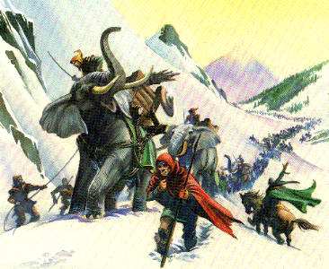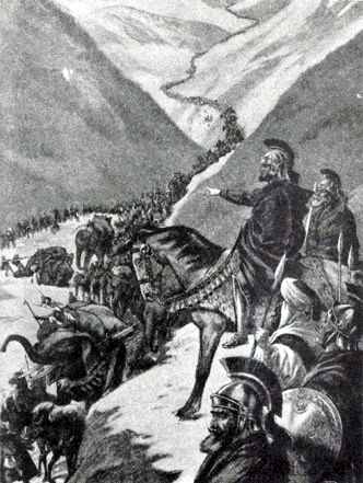Hannibal passe les Alpes avec son armée. C'est une terrible épreuve. C'est l'automne (mi-octobre 218 avant JC)et les premières neiges tombent. Au total il faudra 9 jours à l'armée carthaginoise pour gravir les pentes et six pour les redescendre. Ce ne sont que 20000 fantassins et 5000 cavaliers qui arrivent épuisés en Italie, heureusement sur le sol d'une population alliée, ils furent bien accueillis par les Gaulois Boïens, récemment soumis par les Romains. (Tout les éléphants avaient péri, sauf deux qui mourront quelques jours après le passage des Alpes).
