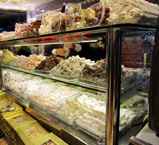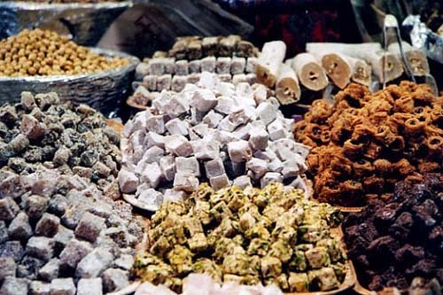 Pour terminer les dessert, les célèbres loukoums (ou lokum) qui signifie "bec sucré" en turc. La pâte à base de loukoum est réalisée à partir de gélatine alimentaire, de fécule et d'eau, auxquelles on ajoute ensuite librement au choix, noisettes, pistaches, noix de coco, vanille et autres parfums (menthe, eau de rose, colorant).