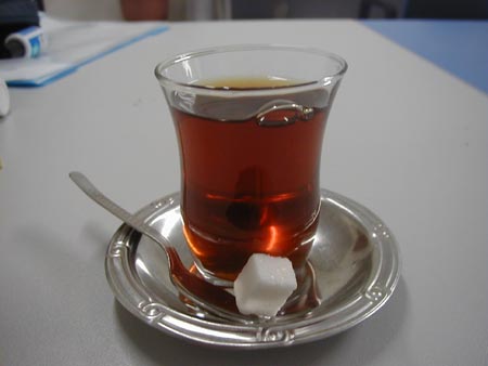 le thé ponctue à présent la journée de tous les Turcs, qui peuvent en boire jusqu'à 10 ou 20 verres par jours ! Le thé se prépare suivant le principe du smovar (l'eau en bas dans une bouilloire et le thé en haut dans une théière). On le sert dans un verre en forme de tulipe. Si on le trouve âpre et fort, on peut le demander clair (açik).