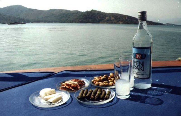 Dans les tavernes (meyhane) ou chez des amis, un repas de mezze peut compter jusqu'à une trentaine de plats, que l'on accompagne de la boisson nationale, le raki (comme l'Ouzo en Grèce), boisson forte parfumée à l'anis, servie avec de l'eau et de la glace, et que l'on déguste doucement par petites gorgées.