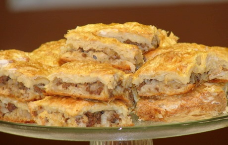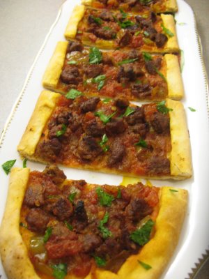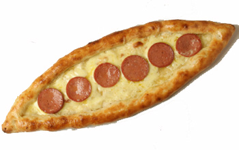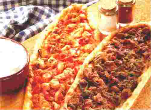 le champ. C'est garni de viande hachée. Il existe une autre variante garnie d'oeuf, de viande ou de sucuk (saucisse séchée à base de viande rouge hachée, d'épices, d' ail, de poivre et de sel).