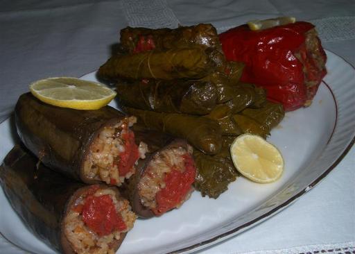 Dolma / Sarma (farci plein / entourer emballer) ressemble aux dolmades grecs, ce sont des feuille de vigne (ou choux, poireaux) sont enroulées dans un mélange de riz boulgour avec ou sans viande avec eventuellement d'autre ingrédients. Consommés chauds ou froids (yaourt, de la menthe séchée, de l'origan, du poivron rouge et de l'huile).
